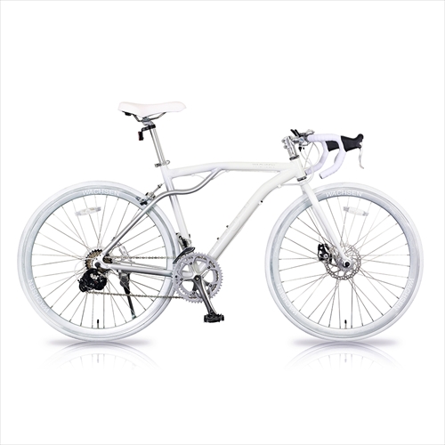 曲線フレームに銀色をアクセントにほどこし、翼をイメージさせるような純白を基調としたフレーム。軽量のアルミニウムボディと前輪のディスクブレーキにより制動性の高い走行を実現。セミディープリムのロゴが存在を主張します。伸縮式のスタンド、シマノ14段変速を装備した普段使いにも便利なロードバイクです。 |