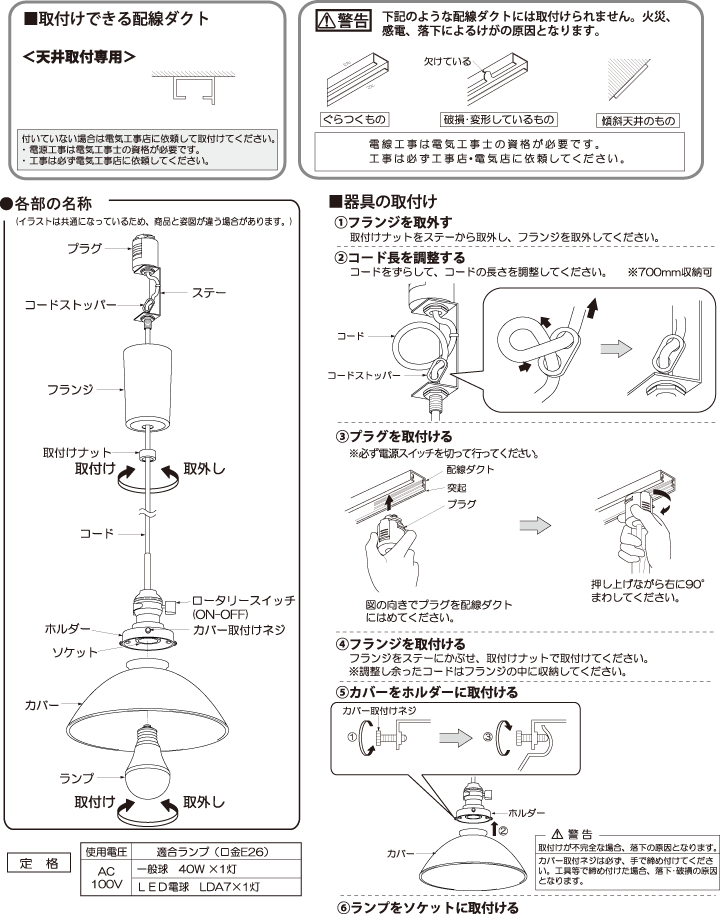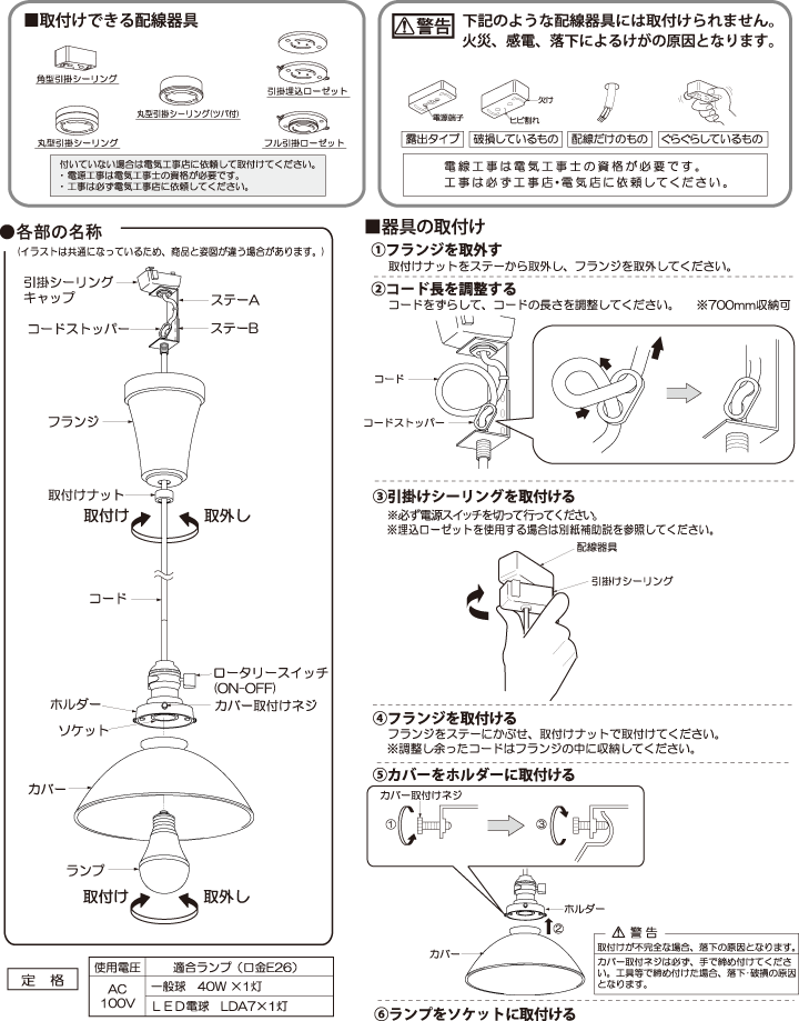 5.真鍮製(1・2共通)、6.真鍮黒塗製(3・4共通) 灯具の傾きを修正するためのパイプを採用し、シェードなどの傾きを吸収します。(完全に吸収する訳ではありません) また、高級感を演出するため、他社製品などで見られる樹脂は使用していません。 E17 LEDランプに変更可能です。お取り替えの際は家電量販店などでお買い求めください。(定格 使用電圧 100V LDA6 1灯)