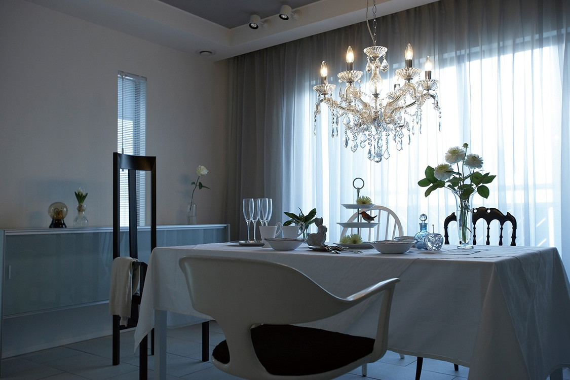 透明なシャンデリア電球を6つ使用し、お部屋の主照明やお洒落なお店の演出照明などに活躍。